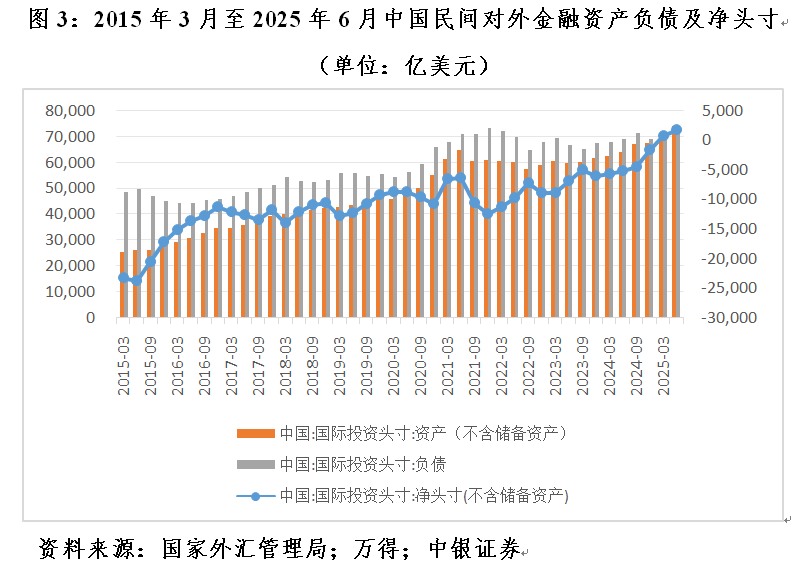 根据最新国际投资头寸表(IIP)数据,截至2025年二季度末,我国民间对外净债权1819亿美元,环比增加1034亿美元。其中,民间对外金融资产增加2735亿美元,对外金融负债增加1701亿美元(见图3);民间对外金融资产余额7.44万亿美元,占到国家对外金融资产总额的67.2%,相当于名义国内生产总值(GDP)的38.7%,二者均创2004年有数据以来的新高。