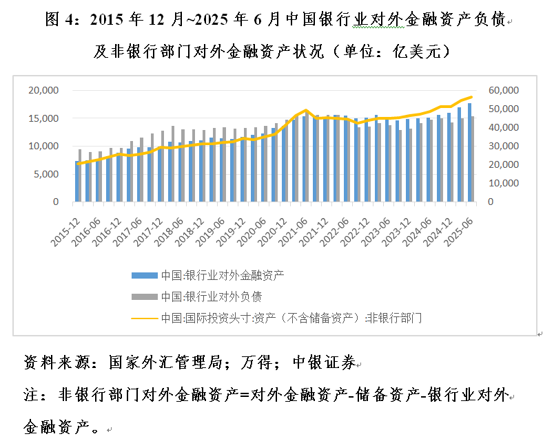 如2020年三季度至2022年一季度,人民币总体面临升值压力,境内外汇供大于求(银行累计结售汇顺差4485亿美元),我国民间对外金融资产新增1.31万亿美元。其中,非银行部门新增9838亿美元,占比75.0%;银行部门新增3280亿美元,占比25.0%。2022年二季度至2025年一季度,人民币总体承压,境内外汇供不应求(银行累计结售汇逆差2773亿美元),民间对外金融资产新增上万亿美元。其中,非银行部门新增9519亿美元,占比88.0%;银行部门新增1293亿美元,仅占12.0%,较2020年三季度至2022年一季度占比回落了13个百分点。2025年二季度,人民币止跌反弹,境内外汇供求形势逆转,民间对外金融新增过千亿美元。其中,非银行部门新增1994亿美元,占比72.9%;银行部门新增741亿美元,占比27.1%,较2022年二季度至2025年一季度占比回升了15.1个百分点(见图1和图4)。